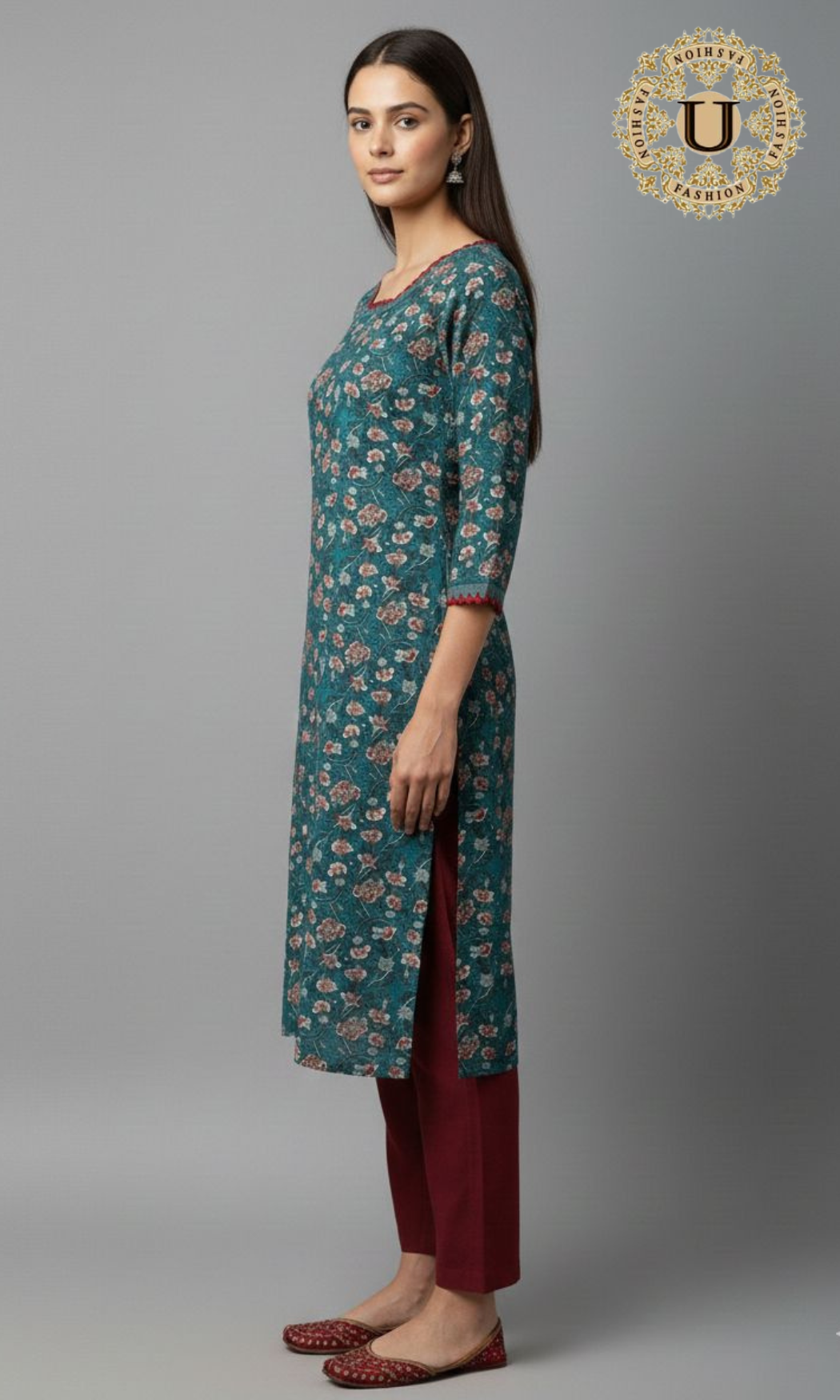 Elevate your everyday wardrobe with this versatile green cotton printed long kurti, designed for the modern professional. Crafted from breathable cotton fabric, this piece seamlessly transitions from office meetings to casual outings with effortless style. The thoughtful print adds visual interest while maintaining a polished appearance suitable for workplace settings. The generous length provides comfort and coverage, making it an ideal choice for those seeking both sophistication and practicality. Perfect for layering or wearing standalone, this kurti combines contemporary design with timeless appeal for the discerning woman.
