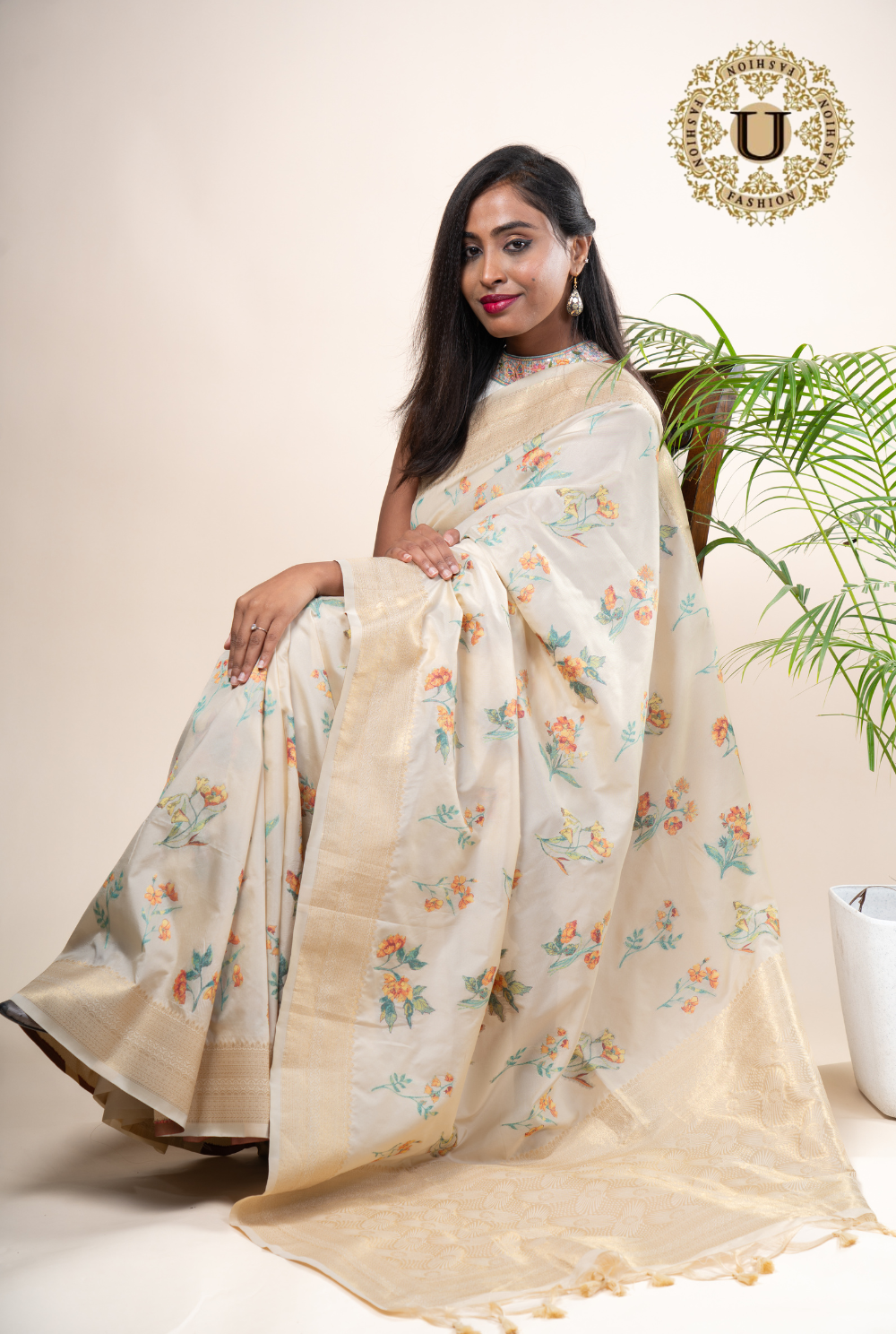 This offwhite semi-silk fabric features a delicate zari border and soft blended silk texture, enhanced with pastel-colored woven floral motifs. Its elegant yet understated design makes it ideal for small functions, festive occasions, and professional conferences, combining traditional charm with versatile sophistication.